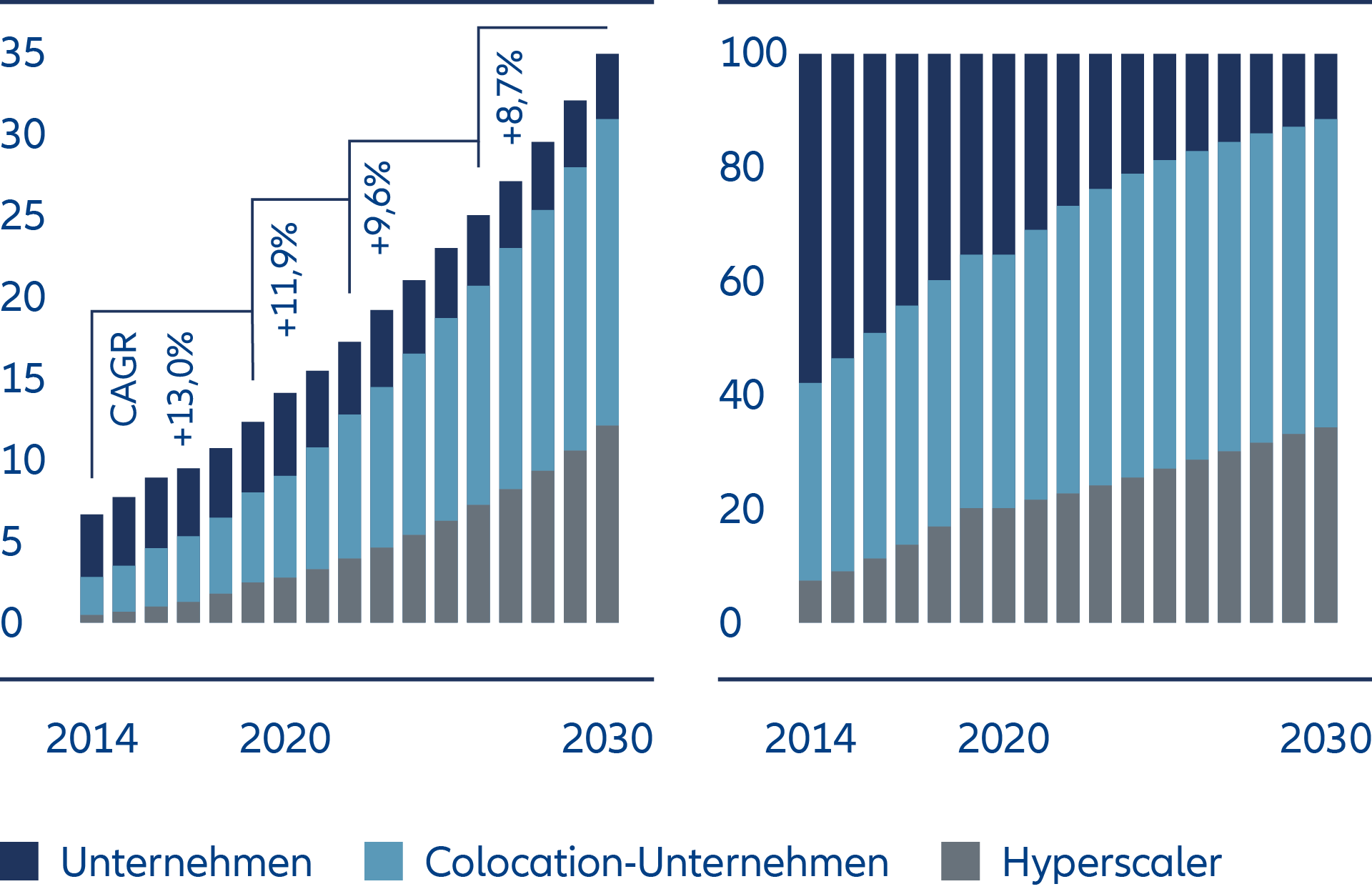 * Die Nachfrage wird anhand des Stromverbrauchs gemessen, um die Anzahl der Server widerzuspiegeln, die ein Rechenzentrum beherbergen kann. Die Nachfrage umfasst den Bedarf für Speicher, Server und Netzwerke. Quelle: Why invest in the data center economy, McKinsey