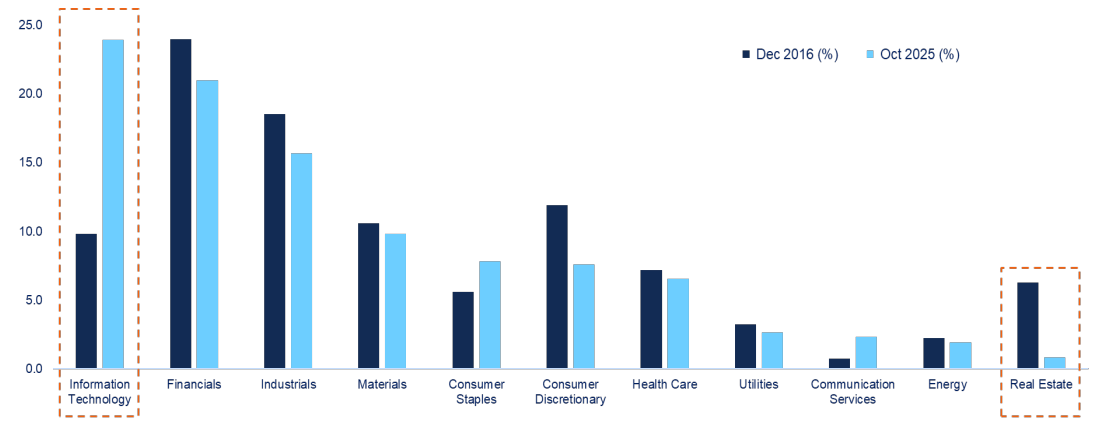 Source: IDS GmbH, Allianz Global Investors. Data as of end October 2025 and December 2016. *MSCI Real Estate Sector Classification was created in 2016.