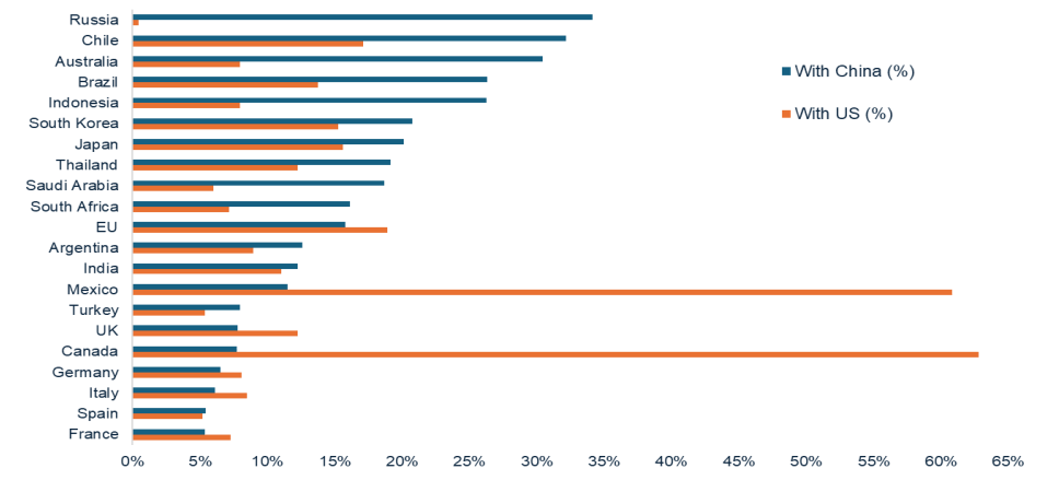Chart 1: Share of total trade with China and with the US (ranked by share of trade with China)